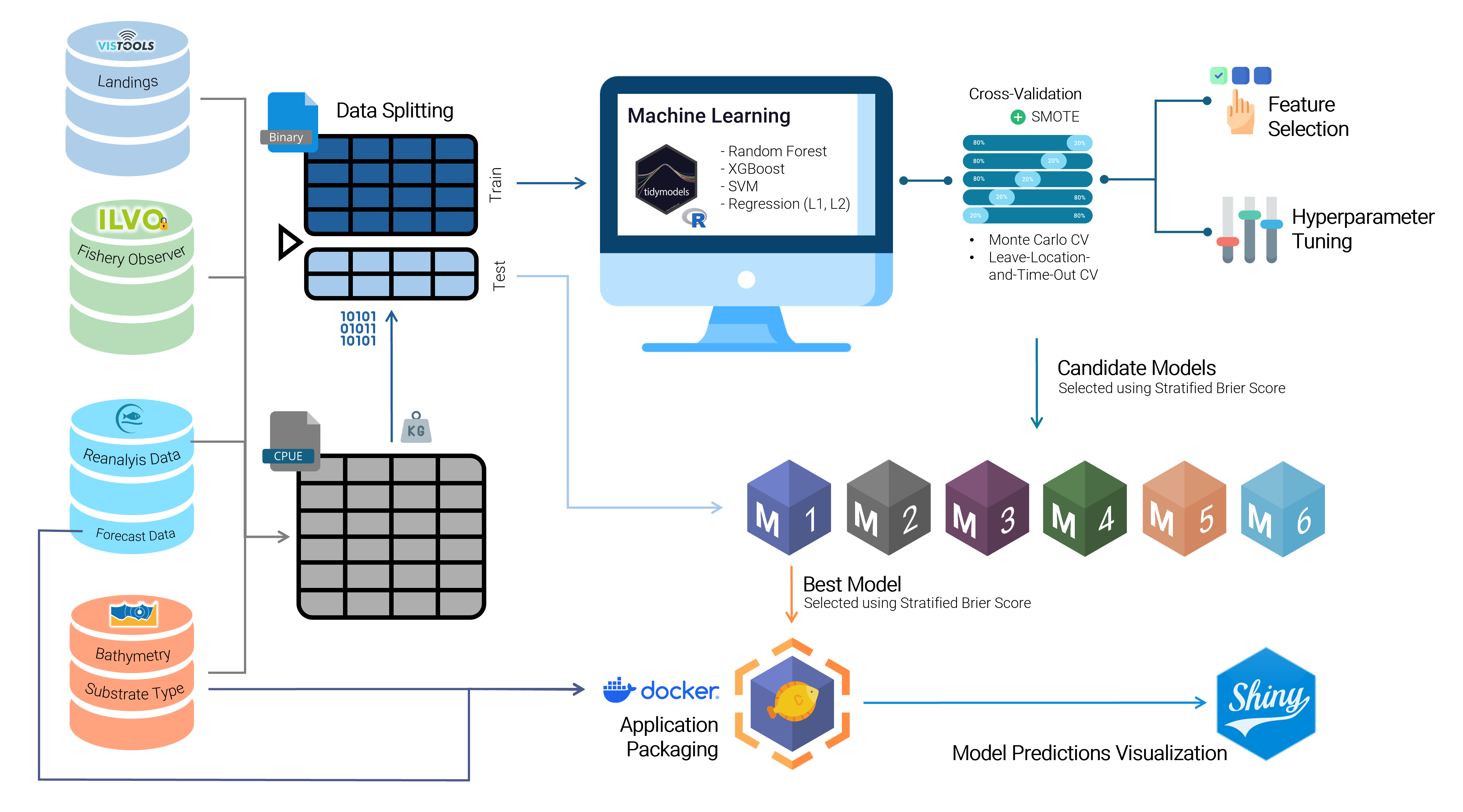 The previous section outlines our objective to create models that facilitate informed decision-making, including the Fishing Suitability Model (Fig 1). This model focuses on two key species for the Belgian fleet: common sole (Solea solea) and European plaice (Pleuronectes platessa). It generates forecast maps that pinpoint suitable areas for catching these species, promoting selective and sustainable fishing practices. Catches are classified as either “suitable” or “not suitable” based on a defined threshold (Vilela & Bellido, 2015). We have set these thresholds at 50 kg for sole and 150 kg for plaice, based from interviews from vessel owners. These thresholds are then standardized against the mean fishing effort, measured in haul duration (minutes). To compute the mean effort, we retain fishing hauls that meet or exceed the threshold weights for each species and then average the fishing effort. For brevity, we will refer to the fish species using FAO codes: SOL for sole and PLE for plaice in this section and the following ones.